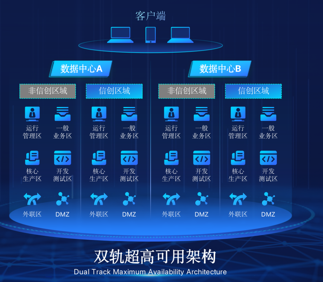 庄闲在企业面临自主创新IT基础重构过程中,推出的全新架构双轨超高可用架构(简称DTMAA),在双活数据中心的分区调度基础上,添加每个数据中心内信创域和非信创域的分域调度,来实现分区分域协同的多活双轨超高可用。