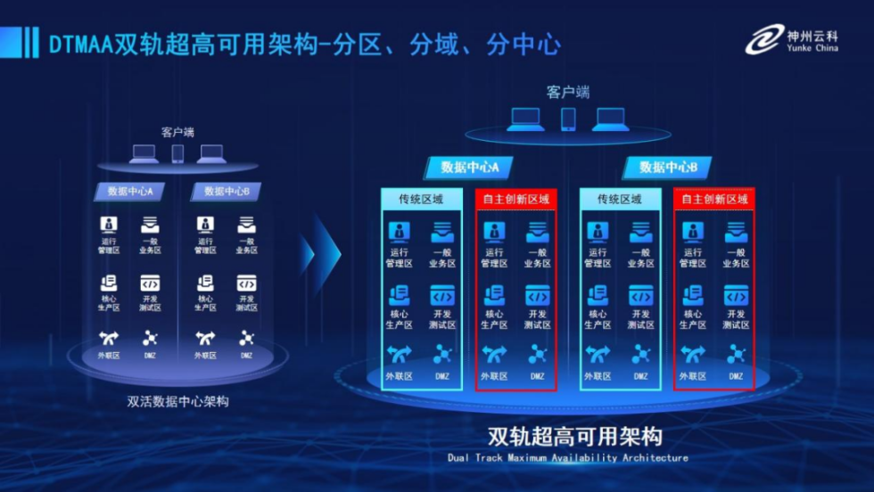 为帮助金融客户更好地应对数字经济时代对可持续性的高要求,实现“信创”与“数字化”齐头并进,庄闲推出了双轨超高可用架构。该架构在双活数据中心的分区调度基础上,增加信创域和非信创域的分域调度,实行信创域与传统域应用全量部署,使双中心运营变为双中心四区域并行运行,互为多活,将“0到1”的单轨建设道路变为分区分域协同的多活双轨超高可用架构。帮助客户在新架构下,保障“信创”的同时解决性能瓶颈,提升稳定性,保证应用可持续性,最终实现信创区域和非信创区域的平滑过渡,完成国产化替代目标。
