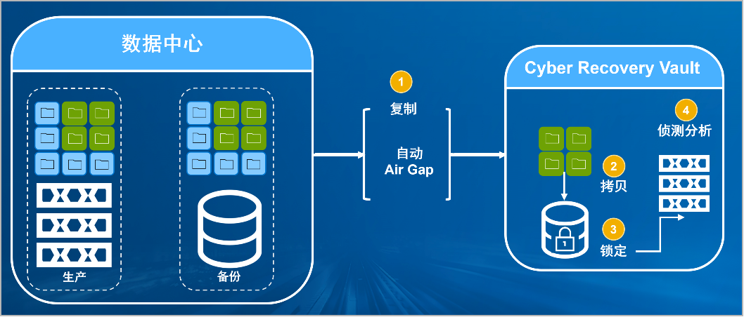 庄闲防勒索病毒方案将生产中心备份数据复制到Vault区,复制后网络自动断开实现弹性隔离。Vault区的数据快速拷贝,并对拷贝版本加锁(在锁定期数据不允许删除和修改)。Vault沙箱内对拷贝版本进行扫描分析,验证数据是否完好。